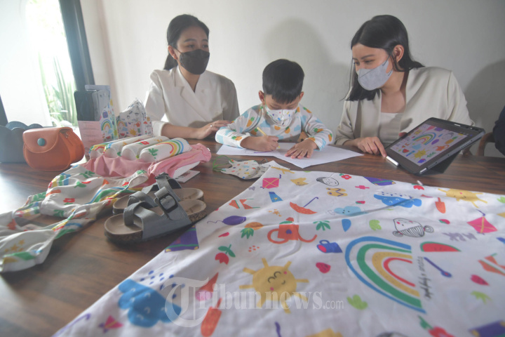 FASHION ANAK - Model nasional asal Surabaya, Yovita Lesmana (kiri) dan sang adik, Ananta Kwok menunjukkan desain pakaian, aksesoris hingga masker untuk anak dengan nama Majoli, Kamis (/9/2/2023). Ada empat brand yang dipilih untuk dijadikan sebuah karya Majoli Family yakni fesyen anak, aksesories seperti tas, sepatu. SURYA/AHMAD ZAIMUL HAQ