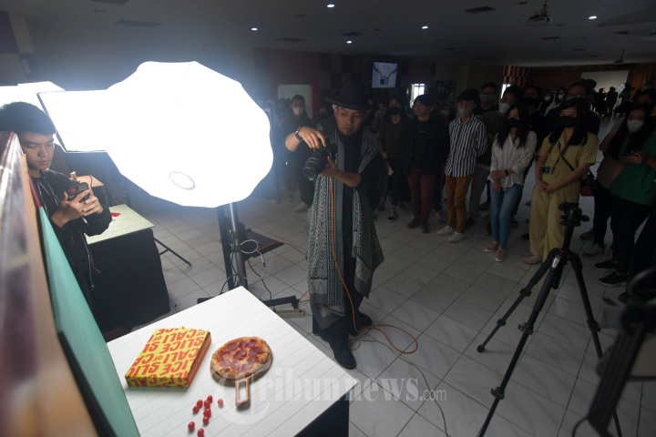 WORKSHOP FOTOGRAFI - Photography Educator, Moch Rizky membagikan teknik lighting dalam memotret produk dan fashion dalam Wokrshop Product and Fashion Photography Lighting fir E-Commerce Catalogeu di Ubaya, Kamis (25/5/2023). Peran lighting dalam pemotretan, sangat utama dan fundamental dari kamera. Sebab, ada karakter lighting, dan sumber cahaya. SURYA/AHMAD ZAIMUL HAQ