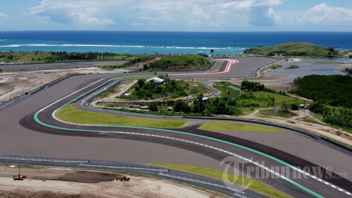 Foto udara Pertamina Mandalika International Street Circuit di Kawasan Ekonomi Khusus (KEK) Mandalika, Praya, Lombok Tengah, Nusa Tenggara Barat (NTB), Minggu (23/1/2022). Progres pembenahan race track dan sarana penunjang Pertamina Mandalika International Street Circuit sudah mendekati 100 persen dan ditargetkan rampung pada Februari 2022 untuk digunakan pada perhelatan MotoGP Grand Prix of Indonesia yang diselenggarakan pada 18-20 Maret 2022. TRIBUNNEWS/IRWAN RISMAWAN