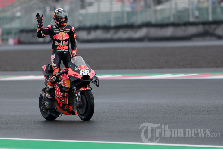 Pembalap dari tim KTM Red Bull Factory Racing Miguel Oliveira berselebrasi usai menjuarai seri kedua MotoGP di Pertamina Mandalika International Street Circuit di KEK Mandalika, Desa Kuta, Kecamatan Pujut, Praya, Lombok Tengah, NTB, Minggu (20/3/2022). Seri kedua MotoGP dimenangkan oleh pembalap Red Bull Factory Racing Miguel Oliveira, diposisi kedua pembalap Monster Energy Yamaha Fabio Quartararo dan diposisi ketiga pembalap dari tim Pramac Racing Johann Zarco. TRIBUNNEWS/IRWAN RISMAWAN