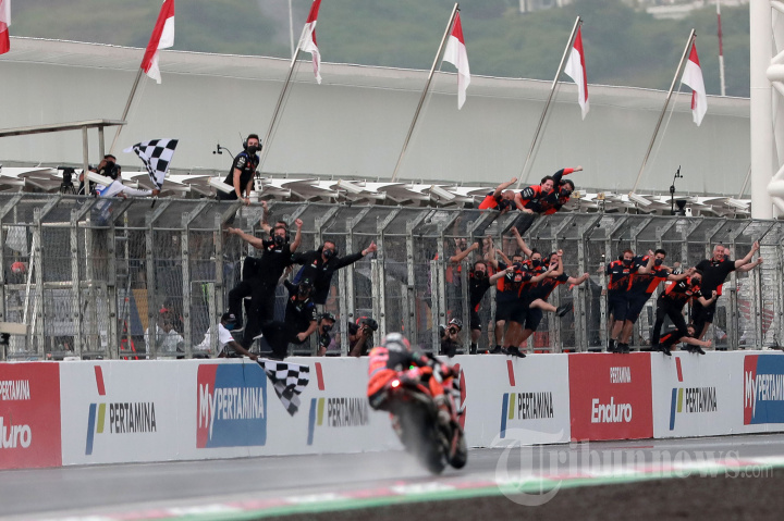 Kru dari tim KTM Red Bull Factory Racing merayakan Miguel Oliveira menjuarai seri kedua MotoGP di Pertamina Mandalika International Street Circuit di KEK Mandalika, Desa Kuta, Kecamatan Pujut, Praya, Lombok Tengah, NTB, Minggu (20/3/2022). Seri kedua MotoGP dimenangkan oleh pembalap Red Bull Factory Racing Miguel Oliveira, diposisi kedua pembalap Monster Energy Yamaha Fabio Quartararo dan diposisi ketiga pembalap dari tim Pramac Racing Johann Zarco. TRIBUNNEWS/IRWAN RISMAWAN