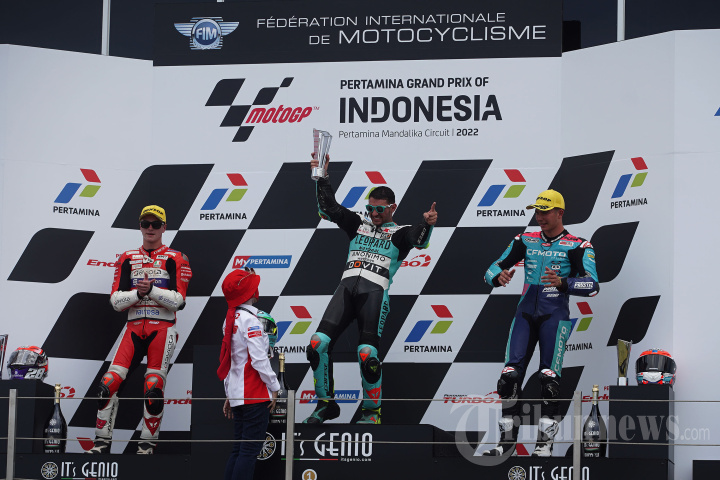 Pembalap dari tim Leopard Racing, Dennis Foggia menerima trofi sebagai juara 1 seri kedua Moto3 2022 di Pertamina Mandalika International Street Circuit (Sirkuit Mandalika), di KEK Mandalika, Desa Kuta, Kecamatan Pujut, Praya, Lombok Tengah, Nusa Tenggara Barat (NTB), Minggu (20/3/2022). Seri kedua Moto3 2022 dimenangkan oleh pembalap dari tim Leopard Racing, Dennis Foggia. TRIBUNNEWS/IRWAN RISMAWAN
