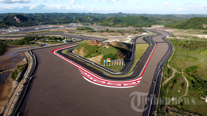 Foto udara Pertamina Mandalika International Street Circuit di Kawasan Ekonomi Khusus (KEK) Mandalika, Praya, Lombok Tengah, Nusa Tenggara Barat (NTB), Minggu (23/1/2022). Progres pembenahan race track dan sarana penunjang Pertamina Mandalika International Street Circuit sudah mendekati 100 persen dan ditargetkan rampung pada Februari 2022 untuk digunakan pada perhelatan MotoGP Grand Prix of Indonesia yang diselenggarakan pada 18-20 Maret 2022. TRIBUNNEWS/IRWAN RISMAWAN
