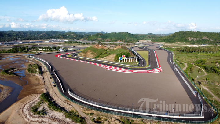 Foto udara Pertamina Mandalika International Street Circuit di Kawasan Ekonomi Khusus (KEK) Mandalika, Praya, Lombok Tengah, Nusa Tenggara Barat (NTB), Minggu (23/1/2022). Progres pembenahan race track dan sarana penunjang Pertamina Mandalika International Street Circuit sudah mendekati 100 persen dan ditargetkan rampung pada Februari 2022 untuk digunakan pada perhelatan MotoGP Grand Prix of Indonesia yang diselenggarakan pada 18-20 Maret 2022. TRIBUNNEWS/IRWAN RISMAWAN