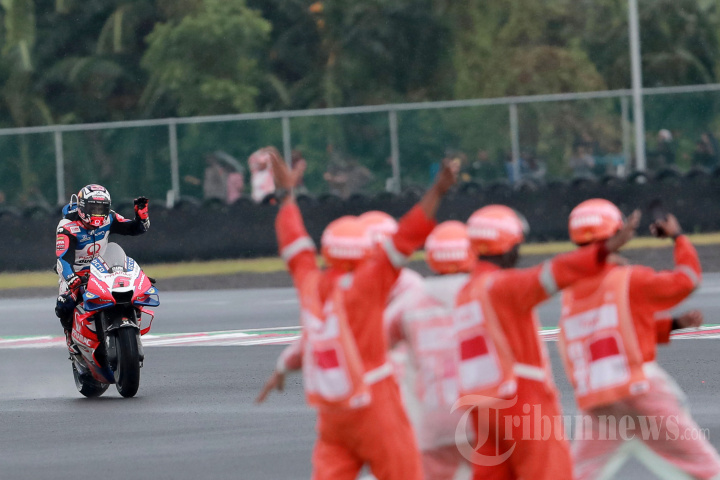 Pembalap dari tim Pramac Racing Johann Zarco berselebrasi usai berada di posisi ketiga padaseri kedua MotoGP di Pertamina Mandalika International Street Circuit di KEK Mandalika, Desa Kuta, Kecamatan Pujut, Praya, Lombok Tengah, NTB, Minggu (20/3/2022). Seri kedua MotoGP dimenangkan oleh pembalap Red Bull Factory Racing Miguel Oliveira, diposisi kedua pembalap Monster Energy Yamaha Fabio Quartararo dan diposisi ketiga pembalap dari tim Pramac Racing Johann Zarco. TRIBUNNEWS/IRWAN RISMAWAN