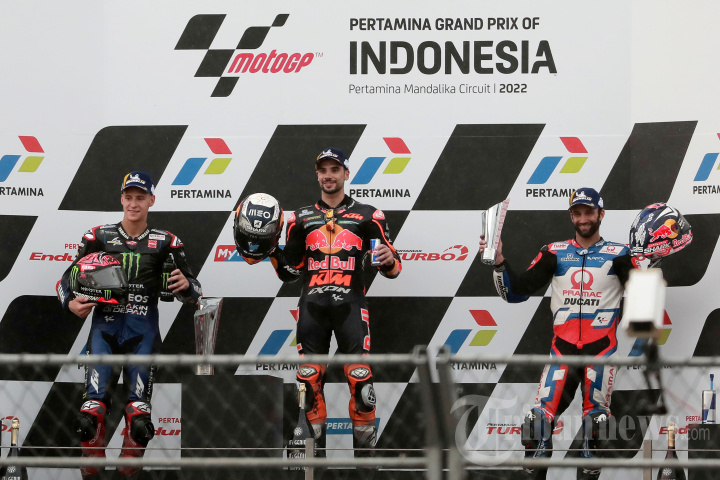 Pembalap dari tim KTM Red Bull Factory Racing Miguel Oliveira (tengah) bersama pembalap dari tim Monster Energy Yamaha Fabio Quartararo (kiri) dan pembalap Pramac Racing Johann Zarco (kanan) saat penyerahan piala pada seri kedua MotoGP di Pertamina Mandalika International Street Circuit di KEK Mandalika, Desa Kuta, Kecamatan Pujut, Praya, Lombok Tengah, NTB, Minggu (20/3/2022). Seri kedua MotoGP dimenangkan oleh pembalap Red Bull Factory Racing Miguel Oliveira, diposisi kedua pembalap Monster Energy Yamaha Fabio Quartararo dan diposisi ketiga pembalap dari tim Pramac Racing Johann Zarco. TRIBUNNEWS/IRWAN RISMAWAN
