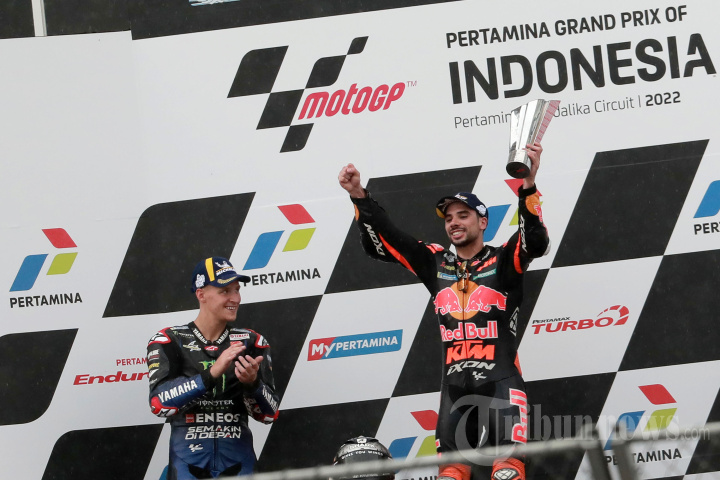 Pembalap dari tim KTM Red Bull Factory Racing Miguel Oliveira (kanan) bersama pembalap dari tim Monster Energy Yamaha Fabio Quartararo (kiri) berselebrasi saat penyerahan piala pada seri kedua MotoGP di Pertamina Mandalika International Street Circuit di KEK Mandalika, Desa Kuta, Kecamatan Pujut, Praya, Lombok Tengah, NTB, Minggu (20/3/2022). Seri kedua MotoGP dimenangkan oleh pembalap Red Bull Factory Racing Miguel Oliveira, diposisi kedua pembalap Monster Energy Yamaha Fabio Quartararo dan diposisi ketiga pembalap dari tim Pramac Racing Johann Zarco. TRIBUNNEWS/IRWAN RISMAWAN
