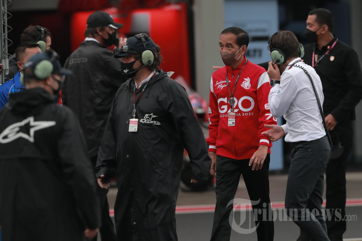 Presiden Joko Widodo saat menyaksikan seri kedua MotoGP di Pertamina Mandalika International Street Circuit di KEK Mandalika, Desa Kuta, Kecamatan Pujut, Praya, Lombok Tengah, NTB, Minggu (20/3/2022). TRIBUNNEWS/IRWAN RISMAWAN