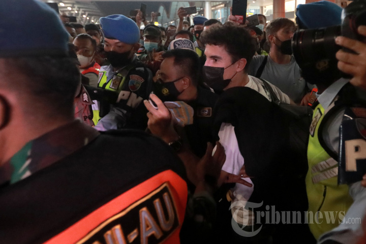 Pembalap dari tim Repsol Honda Marc Marquez tiba di Bandara Internasional Lombok (BIL) di Praya, Lombok Tengah, NTB, Rabu (16/3/2022). Seluruh pembalap dari 12 tim MotoGP sudah tiba di Lombok untuk mengikuti balapan MotoGP seri kedua 2022 yang akan berlangsung pada 18-20 Maret 2022 di Pertamina Mandalika International Street Circuit.