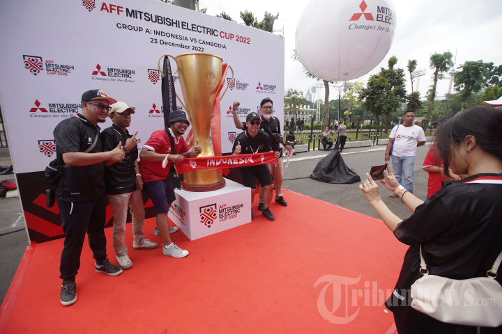 Suporter Indonesia berfoto di dekat replika trophy Piala AFF sebelum pertandingan Grup A Indonesia vs Kamboja di Stadion Utama Gelora Bung Karno (GBK) Jakarta, Jumat (23/12/2022). Pada pertandingan itu Indonesia berhasil mengalahkan Kamboja dengan skor 2-1. TRIBUNNEWS/HERUDIN