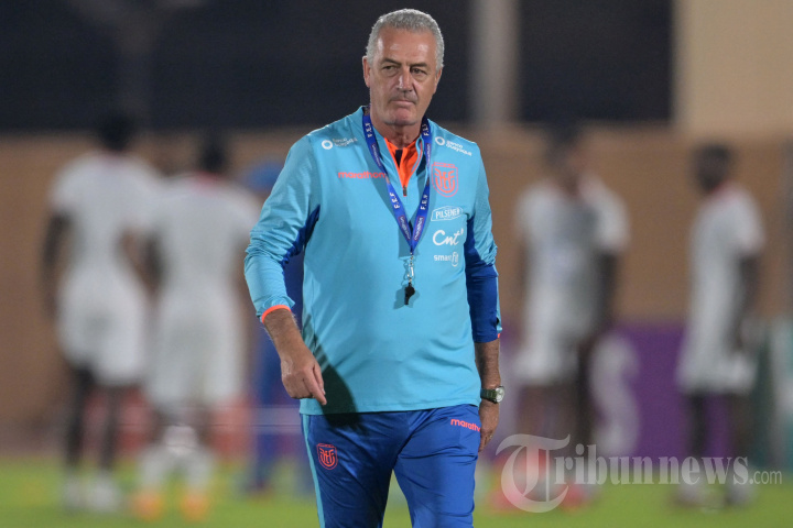 Gestur Pelatih Timnas Ekuador berkebangsaan Argentina, Gustavo Alfaro dalam sesi latihan di Essaimer SC, Doha, Jumat (17/11/2022). Timas Ekuador akan menjalani pertandingan pembuka Piala Dunia 2022 melawan tuan rumah Timnas Qatar pada 20 November 2022 besok. (Photo by Raul ARBOLEDA / AFP)