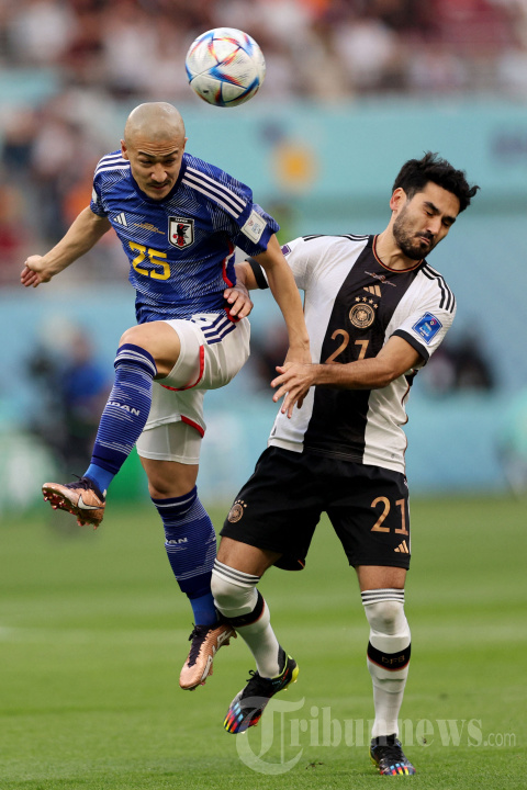 Pemain depan Timnas Jepang, #25 Daizen Maeda (kiri) berebut bola atas dengan gelandang Timnas Jerman, #21 Ilkay Gundogan dalam laga sepak bola Grup E Piala Dunia 2022 Qatar antara Jerman melawan Jepang di Stadion Internasional Khalifa, di Doha, Qatar, Rabu (23/11/2022) waktu setempat. AFP/ADRIAN DENNIS