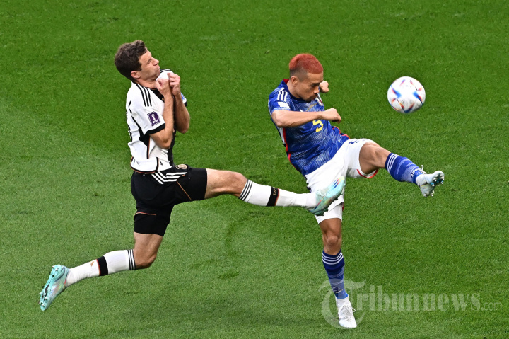 Pemain depan Timnas Jerman, #13 Thomas Mueller (kiri) berebut bola dengan bek Timnas Jepang, #05 Yuto Nagatomo dalam laga sepak bola Grup E Piala Dunia 2022 Qatar antara Jerman melawan Jepang di Stadion Internasional Khalifa, di Doha, Qatar, Rabu (23/11/2022) waktu setempat. AFP/ANNE-CHRISTINE POUJOULAT