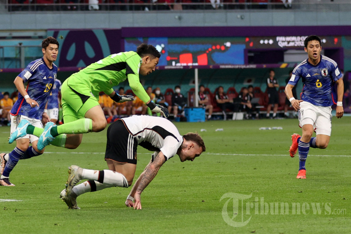 Penjaga gawang Timnas Jepang, #12 Shuichi Gonda (kiri) melanggar bek Timnas Jerman, #03 David Raum (tengah) dalam laga sepak bola Grup E Piala Dunia 2022 Qatar antara Jerman melawan Jepang di Stadion Internasional Khalifa, di Doha, Qatar, Rabu (23/11/2022) waktu setempat. AFP/ADRIAN DENNIS