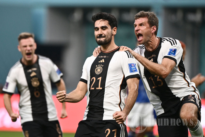 Gelandang Timnas Jerman, #21 Ilkay Gundogan (tengah) melakukan selebrasi dengan pemain depan Jerman, #13 Thomas Mueller (kanan) usai mencetak gol pertama timnya dari titik penalti dalam laga sepak bola Grup E Piala Dunia 2022 Qatar antara Jerman melawan Jepang di Stadion Internasional Khalifa, di Doha, Qatar, Rabu (23/11/2022) waktu setempat. AFP/JEWEL SAMAD