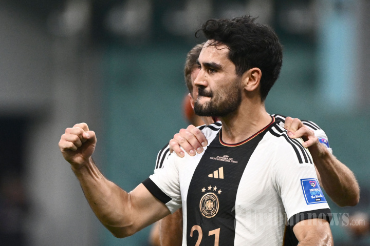 Gelandang Timnas Jerman, #21 Ilkay Gundogan melakukan selebrasi usai mencetak gol pertama timnya dari titik penalti dalam laga sepak bola Grup E Piala Dunia 2022 Qatar antara Jerman melawan Jepang di Stadion Internasional Khalifa, di Doha, Qatar, Rabu (23/11/2022) waktu setempat. AFP/JEWEL SAMAD