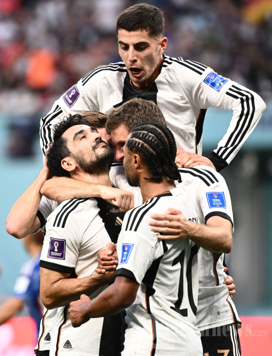 Gelandang Timnas Jerman, #21 Ilkay Gundogan (kiri) melakukan selebrasi bersama rekan-rekannya usai mencetak gol pertama timnya dari titik penalti dalam laga sepak bola Grup E Piala Dunia 2022 Qatar antara Jerman melawan Jepang di Stadion Internasional Khalifa, di Doha, Qatar, Rabu (23/11/2022) waktu setempat. AFP/JEWEL SAMAD
