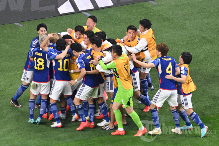 Para pemain Timnas Jepang melakukan selebrasi usai mereka mencetak gol pertama dalam laga sepak bola Grup E Piala Dunia 2022 Qatar antara Jerman melawan Jepang di Stadion Internasional Khalifa, di Doha, Qatar, Rabu (23/11/2022) waktu setempat. AFP/ANTONIN THUILLIER