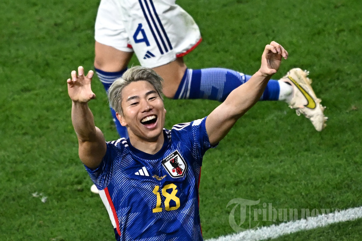 Pemain depan Timnas Jepang, #18 Takuma Asano melakukan selebrasi usai mencetak gol kedua timnya dalam laga sepak bola Grup E Piala Dunia 2022 Qatar antara Jerman melawan Jepang di Stadion Internasional Khalifa, di Doha, Qatar, Rabu (23/11/2022) waktu setempat. AFP/ANNE-CHRISTINE POUJOULAT