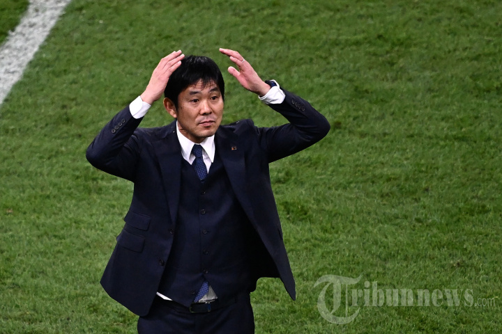 Pelatih Timnas Jepang, Hajime Moriyasu merayakan kemenangan timnya dalam laga sepak bola Grup E Piala Dunia 2022 Qatar antara Jerman melawan Jepang di Stadion Internasional Khalifa, di Doha, Qatar, Rabu (23/11/2022) waktu setempat. AFP/ANNE-CHRISTINE POUJOULAT