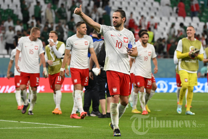 Gelandang Timnas Polandia, #10 Grzegorz Krychowiak bersama rekan-rekannya melakukan selebrasi usai Polandia menang dalam laga sepak bola Grup C Piala Dunia 2022 Qatar antara Polandia melawan Arab Saudi di Education City Stadium, di Al-Rayyan, barat Doha, Qatar, Sabtu (26/11/2022). AFP/ANDREJ ISAKOVIC