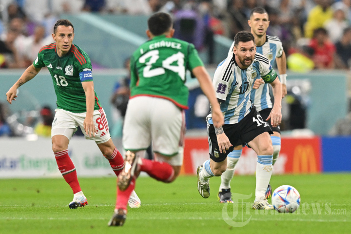 Penyerang Timnas Argentina, #10 Lionel Messi (kanan) menggiring bola dalam laga sepak bola Grup C Piala Dunia 2022 Qatar antara Argentina melawan Meksiko di Stadion Lusail, di Lusail, utara Doha, Qatar, Sabtu (26/11/2022) waktu setempat. AFP/GLYN KIRK