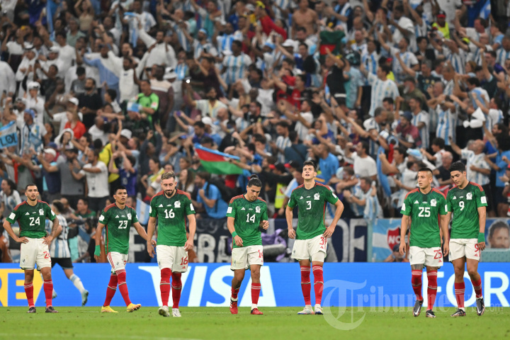 Ekspresi para pemain Timnas Meksiko di akhir laga sepak bola Grup C Piala Dunia 2022 Qatar antara Argentina melawan Meksiko di Stadion Lusail, di Lusail, utara Doha, Qatar, Sabtu (26/11/2022) waktu setempat. AFP/GLYN KIRK