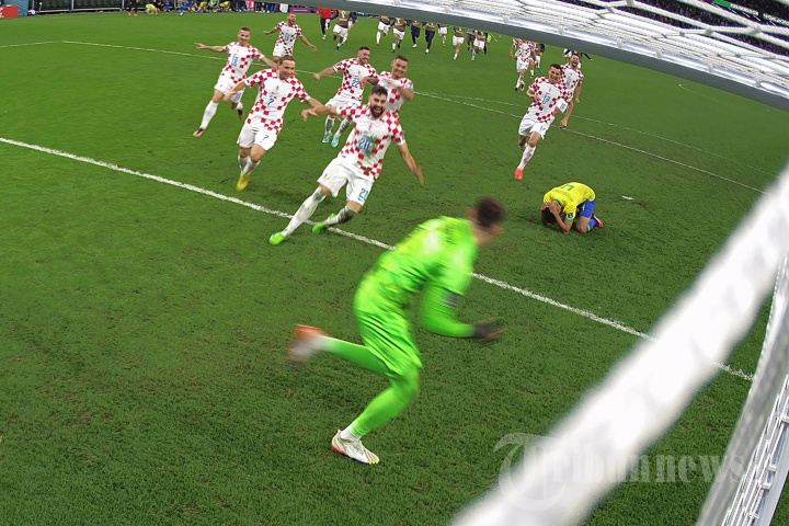 Reaksi bek Brasil Marquinhos (kanan) setelah tendangan penaltinya membentur tiang gawang saat para pemain Kroasia merayakan kemenangan mereka dalam pertandingan sepak bola perempat final Piala Dunia Qatar 2022 antara Kroasia dan Brasil di Stadion Education City di Al-Rayyan, barat Doha, pada 9 Desember 2022. (Photo by Adrian DENNIS / AFP)
