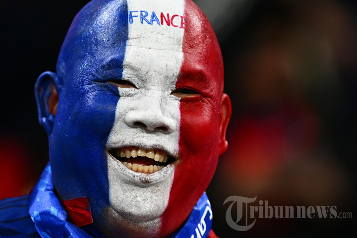 Seorang pendukung Prancis bersorak sebelum dimulainya pertandingan sepak bola perempat final Piala Dunia Qatar 2022 antara Inggris dan Prancis di Stadion Al-Bayt di Al Khor, utara Doha, pada 10 Desember 2022. (Photo by GABRIEL BOUYS / AFP)