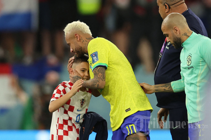 Penyerang Brasil Neymar (Tengah) disambut oleh putra gelandang Kroasia Ivan Perisic setelah Brasil kalah dalam pertandingan sepak bola perempat final Piala Dunia Qatar 2022 antara Kroasia dan Brasil di Stadion Education City di Al-Rayyan, sebelah barat Doha, pada 9 Desember 2022.