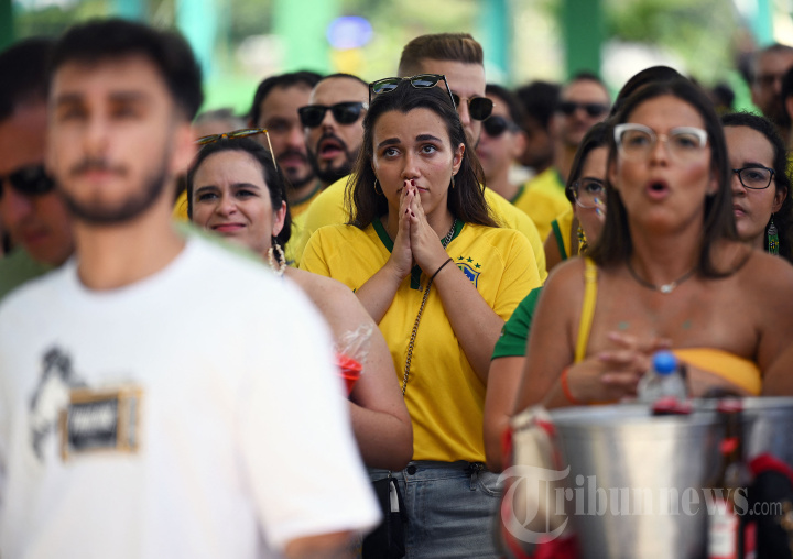 Seorang penggemar Brasil bereaksi saat menonton siaran langsung pertandingan sepak bola putaran perempat final Piala Dunia 2022 Qatar antara Brasil dan Kroasia di Rio de Janeiro, Brasil, pada 9 Desember 2022. (Photo by CARL DE SOUZA / AFP)