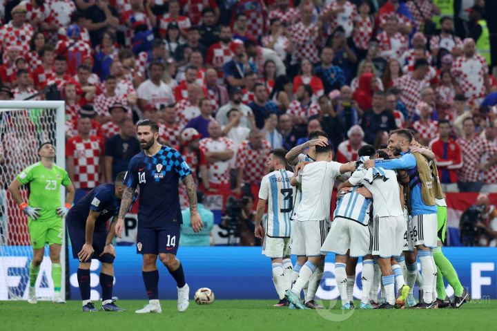 Para pemain Argentina merayakan kemenangan pertandingan semifinal sepak bola Piala Dunia Qatar 2022 antara Argentina dan Kroasia di Stadion Lusail di Lusail, utara Doha. Selasa (13 Desember 2022). (Giuseppe CACACE / AFP)