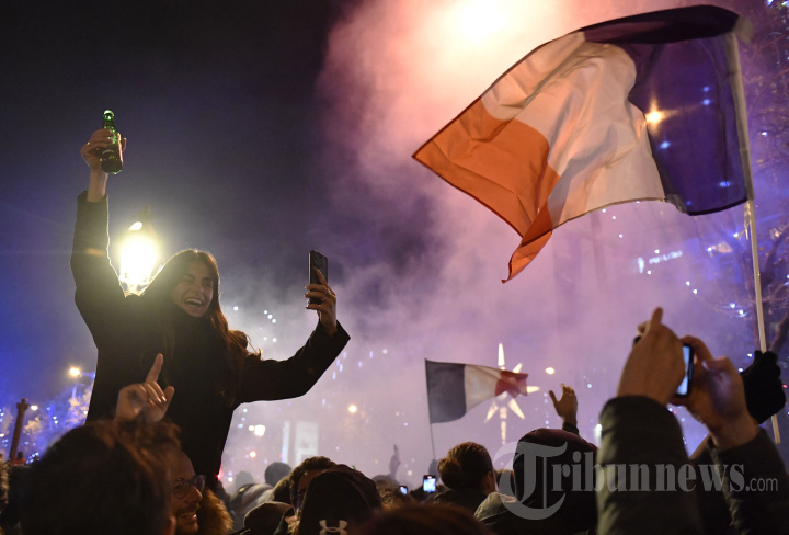 Penggemar sepak bola merayakan kemenangan Prancis atas Maroko di semifinal Piala Dunia Qatar 2022, di Champs-Elysees di Paris pada 14 Desember 2022.