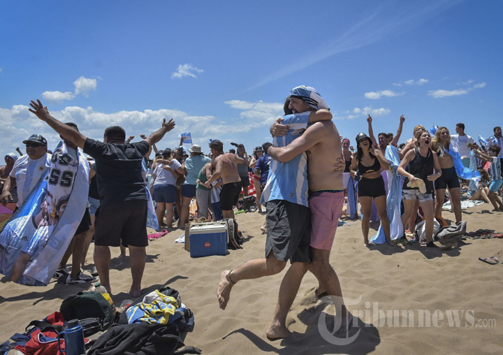 Fans Argentina bereaksi saat menonton siaran langsung pertandingan sepak bola final Piala Dunia Qatar 2022 antara Francia dan Argentina di sebuah pantai di Mar del Plata, Argentina, pada 18 Desember 2022. (Photo by Alfonsina Tain / AFP)