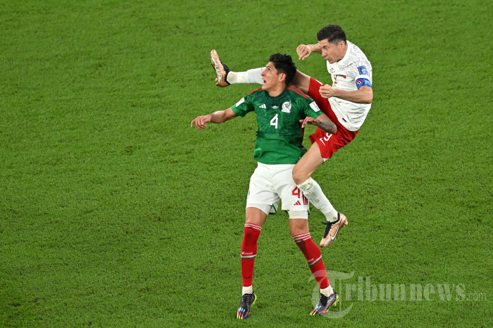 Gelandang Meksiko Edson Alvarez dan penyerang Polandia Robert Lewandowski bertabrakan selama pertandingan sepak bola Grup C Piala Dunia Qatar 2022 antara Meksiko dan Polandia di Stadion 974 di Doha. Selasa (22 November 2022). (Foto oleh Glyn KIRK / AFP)