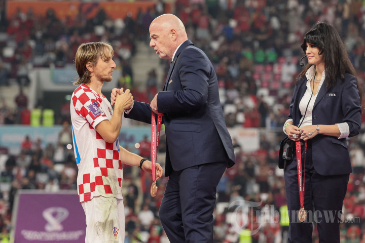 Presiden FIFA, Gianni Infantino (tengah) menyapa gelandang Timnas Kroasia, #10 Luka Modric di podium usai laga play-off perebutan tempat ketiga Piala Dunia Qatar 2022 antara Kroasia melawan Maroko di Khalifa International Stadium, di Doha, Qatar, Sabtu (17/12/2022) waktu setempat. AFP/KARIM JAAFAR
