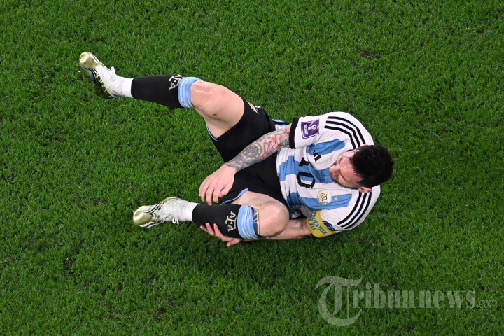 Penyerang nomor Argentina Lionel Messi terjatuh saat pertandingan sepak bola babak 16 besar Piala Dunia Qatar 2022 antara Argentina dan Australia di Stadion Ahmad Bin Ali di Al-Rayyan, sebelah barat Doha. (3 Desember 2022). (Kirill KUDRYAVTSEV / AFP)
