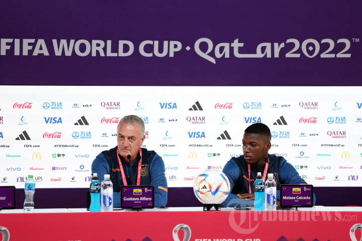 Pelatih Ekuador asal Argentina Gustavo Alfaro (Kiri) dan gelandang Ekuador Moises Caicedo menghadiri konferensi pers di Qatar National Convention Center (QNCC) di Doha pada 19 November 2022 menjelang pertandingan sepak bola Piala Dunia Qatar 2022 antara Qatar dan Ekuador. (Photo by KARIM JAAFAR / AFP)