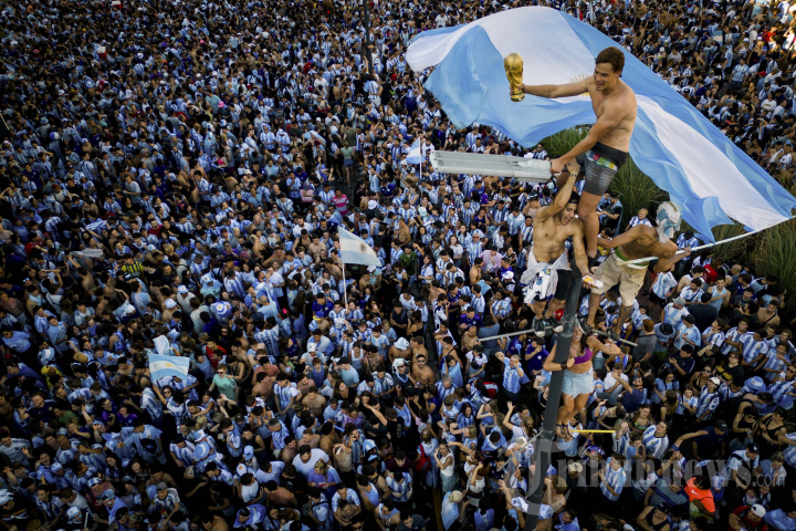 Dalam tampilan udara ini para penggemar Argentina merayakan kemenangan Piala Dunia Qatar 2022 melawan Prancis di Obelisk di Buenos Aires, pada 18 Desember 2022.
