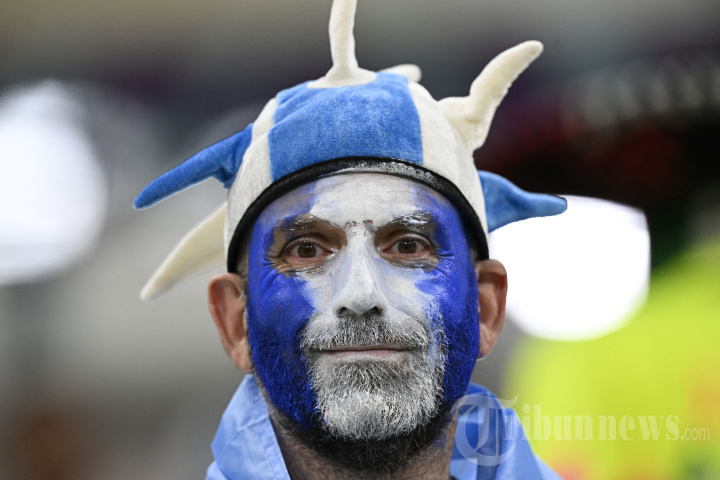 Seorang suporter Timnas Argentina tersenyum saat hadir dalam laga sepak bola Grup C Piala Dunia 2022 Qatar antara Argentina melawan Meksiko di Stadion Lusail, di Lusail, utara Doha, Qatar, Sabtu (26/11/2022) waktu setempat. AFP/ALFREDO ESTRELLA