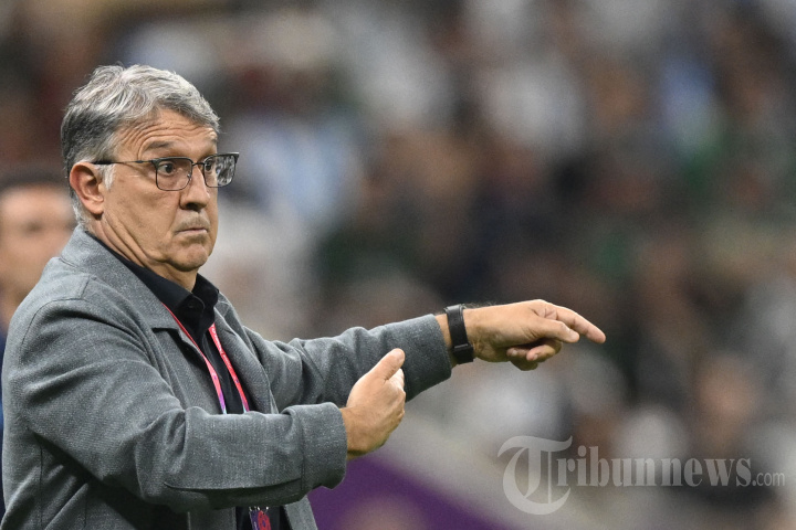 Pelatih Timnas Meksiko asal Argentina, Gerardo Martino memberikan instruksi dari pinggir lapangan dalam laga sepak bola Grup C Piala Dunia 2022 Qatar antara Argentina melawan Meksiko di Stadion Lusail, di Lusail, utara Doha, Qatar, Sabtu (26/11/2022) waktu setempat. AFP/ALFREDO ESTRELLA