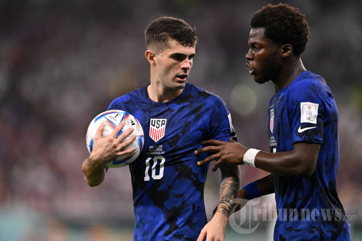 Penyerang Timnas AS, #10 Christian Pulisic (kiri) berbicara dengan gelandang Timnas AS, #06 Yunus Musah dalam laga sepak bola Grup B Piala Dunia 2022 Qatar antara Iran melawan Amerika Serikat di Stadion Al-Thumama, di Doha, Qatar, Selasa (29/11/2022) waktu setempat. AFP/FABRICE COFFRINI