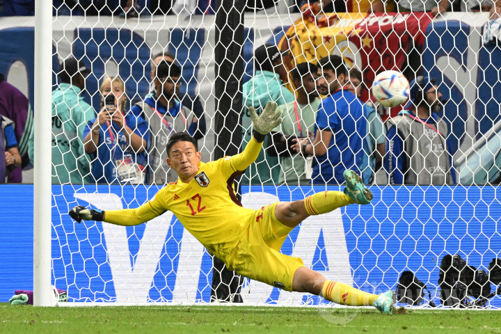 Penjaga gawang Timnas Jepang, #12 Shuichi Gonda gagal menyelamatkan tembakan penalti dari gelandang Timnas Kroasia, #11 Marcelo Brozovic (tidak tampak dalam gambar) saat adu penalti dalam laga sepak bola babak 16 besar Piala Dunia 2022 Qatar antara Jepang melawan Kroasia di Stadion Al-Janoub, di Al-Wakrah, selatan Doha, Qatar, Senin (5/12/2022) waktu setempat. AFP/ANDREJ ISAKOVIC