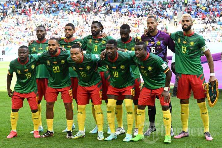 Para pemain Timnas Kamerun berpose untuk foto tim dalam laga sepak bola Grup G Piala Dunia 2022 Qatar antara Kamerun melawan Serbia di Stadion Al-Janoub, di Al-Wakrah, selatan Doha, Qatar, Senin (28/11/2022) waktu setempat. AFP/ISSOUF SANOGO
