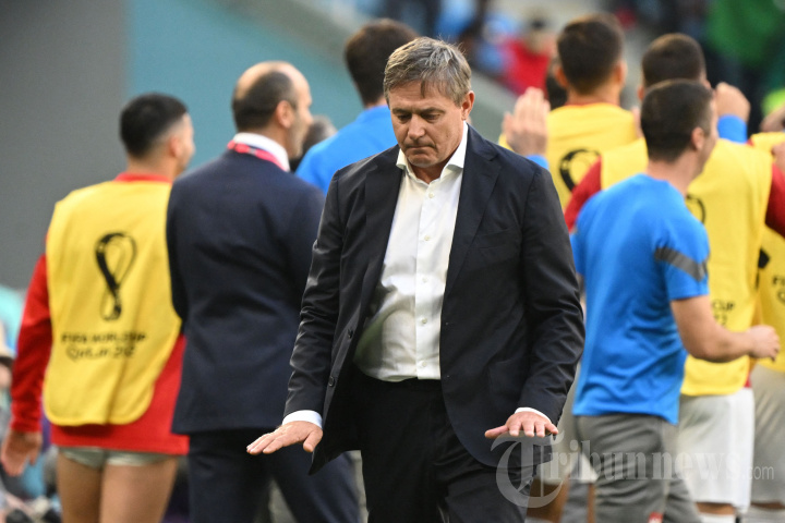 Ekspresi pelatih Timnas Serbia, Dragan Stojkovic dalam laga sepak bola Grup G Piala Dunia 2022 Qatar antara Kamerun melawan Serbia di Stadion Al-Janoub, di Al-Wakrah, selatan Doha, Qatar, Senin (28/11/2022) waktu setempat. AFP/ANDREJ ISAKOVIC