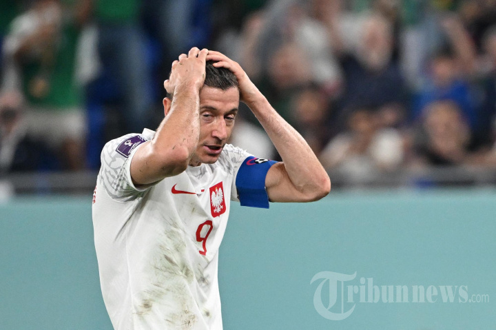 Penyerang Polandia Robert Lewandowski bereaksi setelah kiper Meksiko Guillermo Ochoa menghentikan tendangan penaltinya selama pertandingan sepak bola Grup C Piala Dunia Qatar 2022 antara Meksiko dan Polandia di Stadion 974 di Doha. Selasa (22 November 2022). (Glyn KIRK/AFP )
