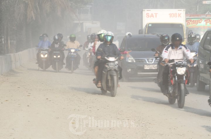 POLUSI - Pengendara melintas di Jalan Daan Mogot Km 13, Cengkareng, Jakarta Barat, yang dipenuhi debu tebal yang beterbangan yang berasal dari proyek pembangunan jalan, Rabu (2/4). Akibat ketebalan debu yang beterbangan, jarak pandang antar kendaraan hanya sekitar 5 meter, dan membahayakan pengguna jalan. (Warta Kota/nur ichsan)