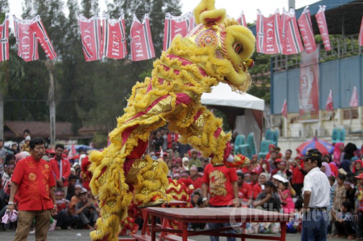 Pemain barongsai di bawah binaan Yayasan Hakka Aceh tampil pada kampanye akbar Partai Aceh di halaman parkir Stadion H Dimurthala, Lampineung, Banda Aceh, Sabtu (5/4/2014). SERAMBI/BUDI FATRIA