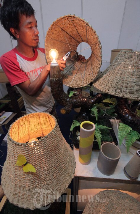 LAMPU HIAS - Seorang perajin mempraktekan membuat lampu hias dari bahan limbah di salah satu stan dalam Jawa Barat Expo 2014 di Graha Manggala Siliwangi, Kota Bandung, Minggu (14/9). Lampu hias yang terbuat dari bahan baku limbah, seperti dus bekas gulungan kain, batok kelapa, serbuk kayu, pelepah pisang, kayu pinus, dus drum bekas wadah obat dan yang lainnya itu diproduksi di kawasan Jalan Jamika, Kota Bandung, dengan harga yang ditawarkan mulai Rp 500 ribu hingga Rp 2,5 juta per unit. TRIBUN JABAR/GANI KURNIAWAN