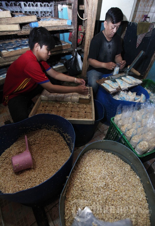 Asep Yusuf Pudin (41) bersama pekerja mengemas tempe ke dalam plastik di rumah produksi tempe HB Putra Cibuntu, Gang Aki Padma, Jalan Terusan Suryani, Kecamatan Babakan Ciparay, Kota Bandung, Selasa (3/4/2018). Kementrian pertanian menargetkan pada 2020 Indonesia tidak akan mengimpor kedelai lagi dan akan terus mendorong swasembada pangan, salah satunya adalah komoditas kedelai. Saat ini, kebutuhan kedelai nasional sekitar 2,7 juta ton per tahun, sedangkan produksi kedelai lokal masih sekitar 700.000 ton. (TRIBUN JABAR/GANI KURNIAWAN)
